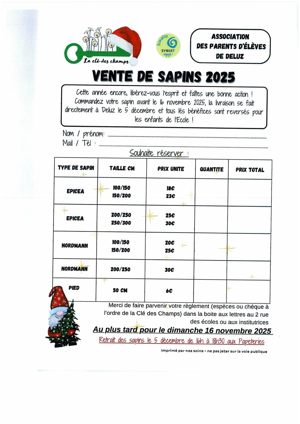 La clé des champs organise une vente de sapins 2025 dont les bénéfices seront reversés aux enfants de l'école de DELUZ