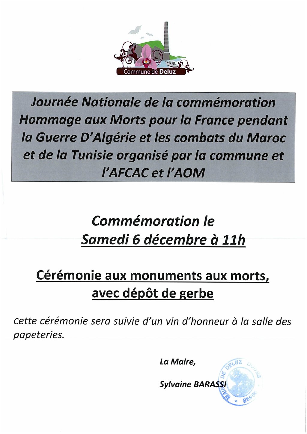 La journée nationale de la commémoration d'hommage aux morts pour la France pendant la guerre d'Algérie et les combats du Maroc et de la Tunisie organisée par la commune et l'AFCAC et l 'AOM se déroulera