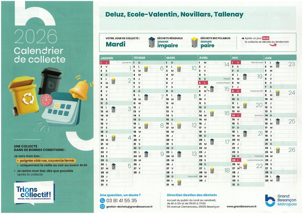 Le calendrier des collectes de 2026 est disponible sur cette page. Il est également disponible en version papier en mairie.